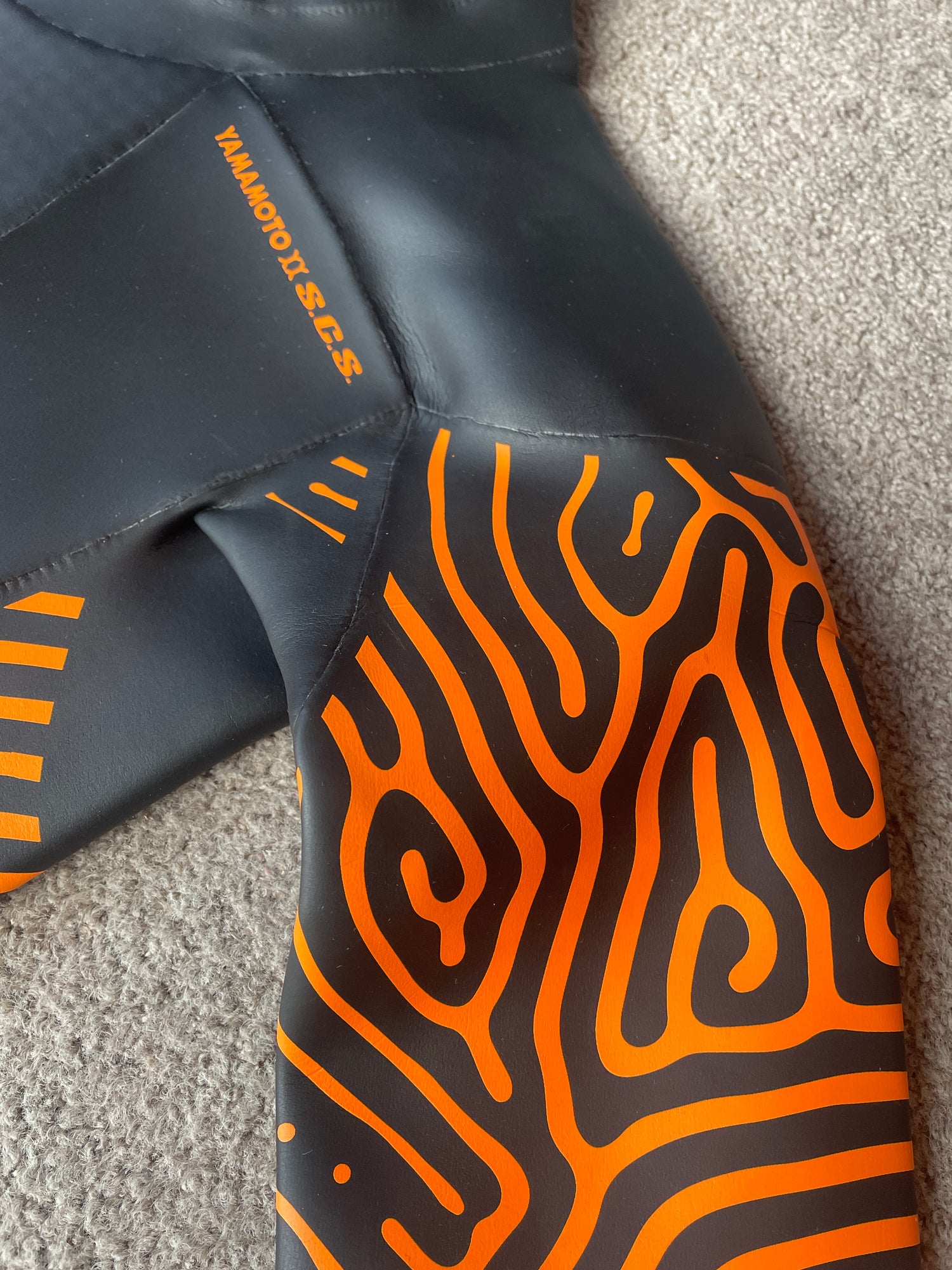 An interesting feature is a need to make the suit as visible as possible for use in busy multi-vessel and user type waterways, but still maintaining the dolphin-like feel of the Yamamoto SCS smooth-skin layer. By using a pattern design of hi-vis Day-Glo water-based ink on one arm and the latissimus dorsi side panel, we have attained an increased level of visibility. The effect is quite striking when in use.